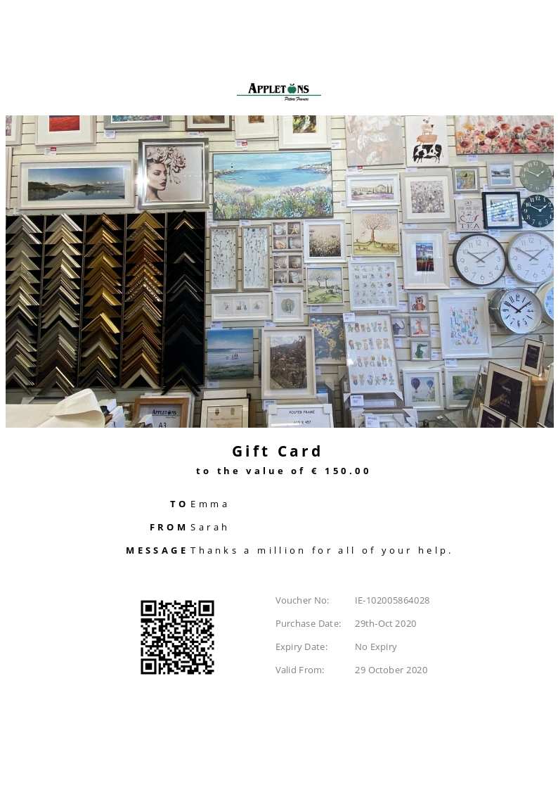 Appletons Picture Framers allows you to purchase instantly printable gift vouchers, special offers and tickets using the Voucher Connect platform.